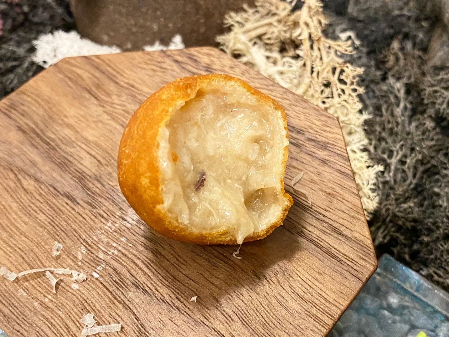 도너츠 같이 생긴 번 안에 삼계죽이 들어가있다.
